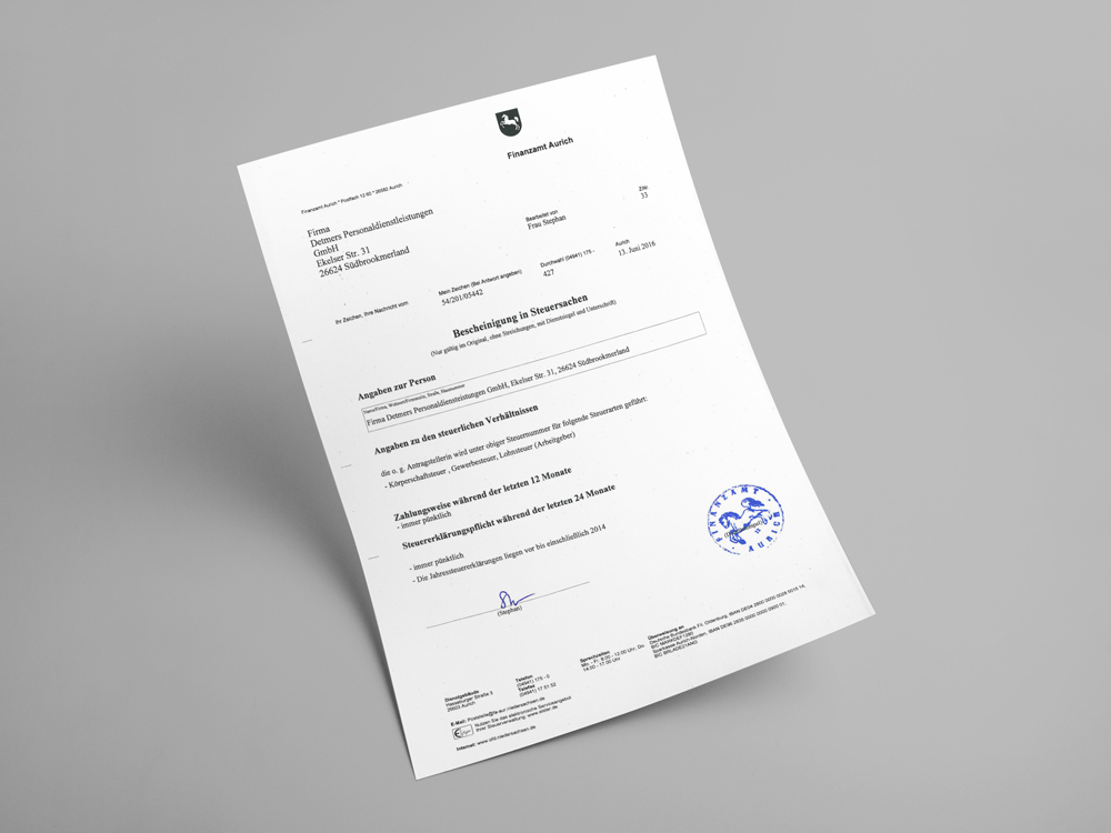 Steuerliche Bescheinigung Finanzamtes Aurich